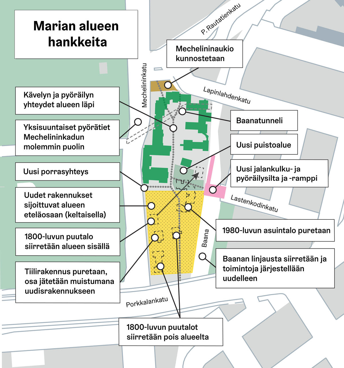 Alueelle suunnitellaan Marian korttelin alittavaa Mariantunnelia pyöräilijöille ja jalankulkijoille Lapinlahdentien ja Baanan välillä. Tutustu hankkeeseen täällä .