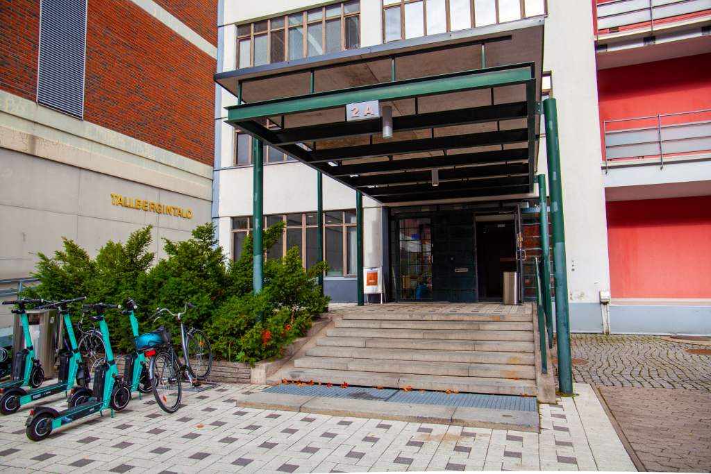 - Sisäänkäynnin ovet erottuvat selkeästi. Oven ulkopuolella on riittävästi vapaata tilaa liikkumiselle esim. pyörätuolin kanssa. Ovi aukeaa avauspainikkeen avulla automaattisesti.