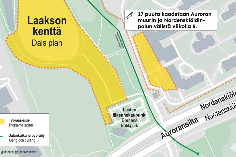 Myöhemmin keväällä pyörä- ja kävelyliikenne siirretään Auroransillan pohjoispuolella kiertoreitille noin neljän viikon ajaksi. Katkon aikana rakennetaan jalankulkijoille ja pyöräilijöille ylikulkusilta tunnelityömaan kohdalle. Kerromme asiasta keväällä lisää.