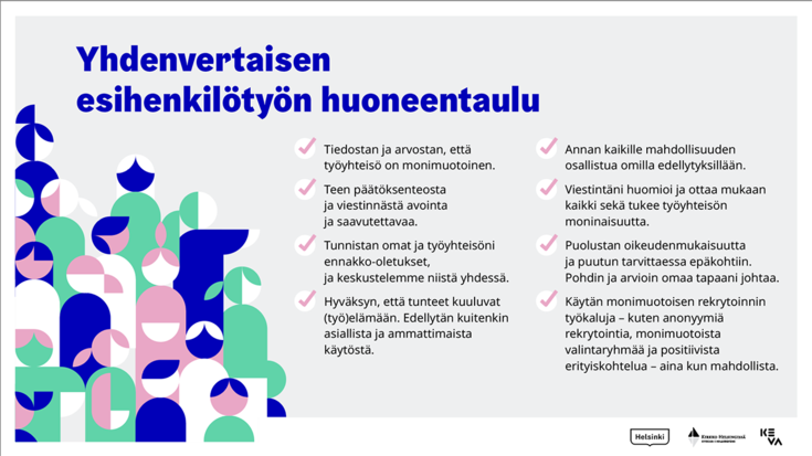 – Kiteytimme ehdotuksia, jotka sopivat useimmille julkisten alojen työpaikoille esihenkilötyön tueksi. Huoneentaulun kahdeksan kohtaa tukevat organisaatioiden olemassa olevia johtamiskäytäntöjä ja auttavat esihenkilöitä tekemään yhdenvertaisuudesta näkyvän osan arkea, kuvaa henkilöstöjohtaja Riitta Kajander Helsingin seurakuntayhtymästä.