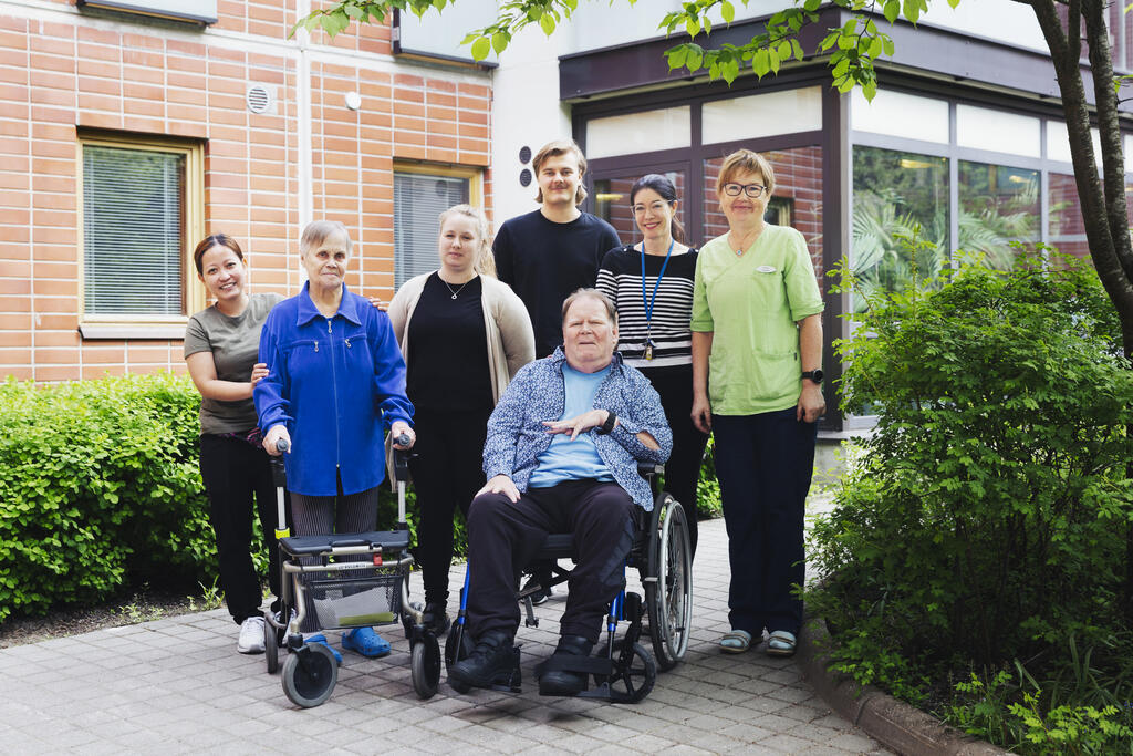 Itäkeskuksen palvelutalon asukkaat Aino Hartikainen ja Reino Turtiainen ovat yhtä hymyä, kun lähihoitaja Marina Sail ja hoiva-avustaja Jenelyn Malana ohjaavat heidät ulos kesäiselle pihalle.