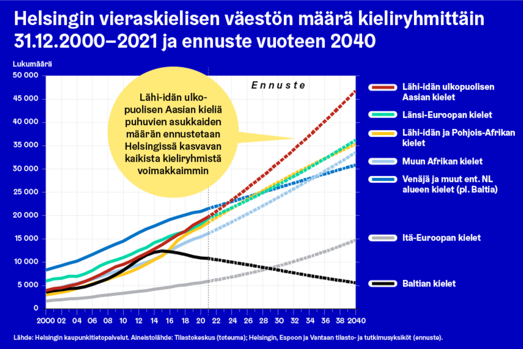 Helsingissä Lähi-idän ulkopuolisen Aasian kieliä (muun muassa kiina, vietnam ja nepali) puhuvien asukkaiden määrän arvioidaan kasvavan kaikista kieliryhmistä suurimmaksi – kasvua 11 500 hengellä vuoden 2030 loppuun menneessä. Venäjän ja muun entisen Neuvostoliiton alueen (pois lukien Baltian alue) kieliä puhuvat ovat pitkään muodostaneet suurimman ryhmän Helsingin vieraskielisistä, mutta tulevina vuosina ryhmän kasvu on useita muita kieliryhmiä selvästi hitaampaa. Baltian alueen kieliä puhuvien määrä sen sijaan tulee pienenemään selvästi.