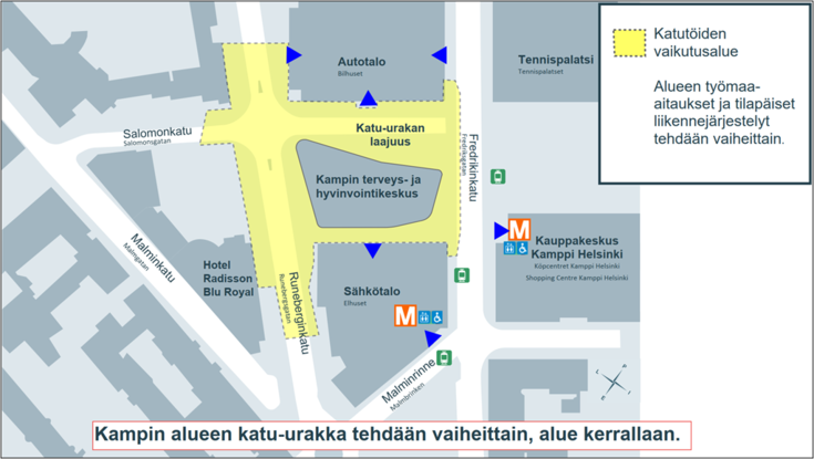 Ensimmäinen kaivuualue on Fredrikinkadun ja Salomonkadun risteyksen länsipuolella, ja sen työt aloitetaan kesä–heinäkuun vaihteessa. Töiden vaikutuksista liikenteeseen kerrotaan yksityiskohtaisemmin urakan edetessä.