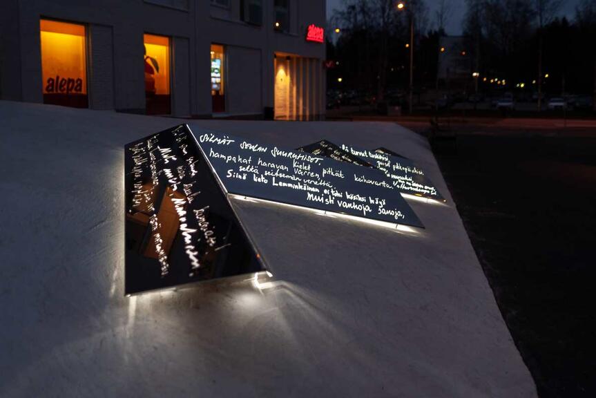 Valonlähteillä-teos on osoitteessa Rosalankuja 5. Valaistut teräsrunkoiset ”mättäät” loistavat pimeässä eri väreissä.