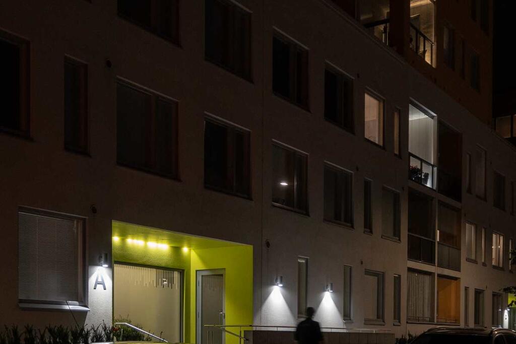 Lähes Valomuurin naapurissa, osoitteessa Föglönkuja 11, näkee OLI-teoksen pylväsvalaisuja.