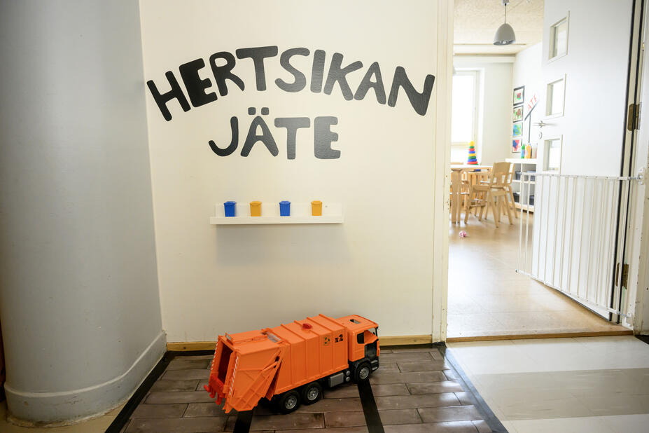 Leikkialueiden teemoja voi hyödyntää monella tavalla lasten kasvatuksessa. Hyvä esimerkki on vaikkapa Hertsikan jäteasema leluineen. Asema opettaa arkielämän kierrätystä.
