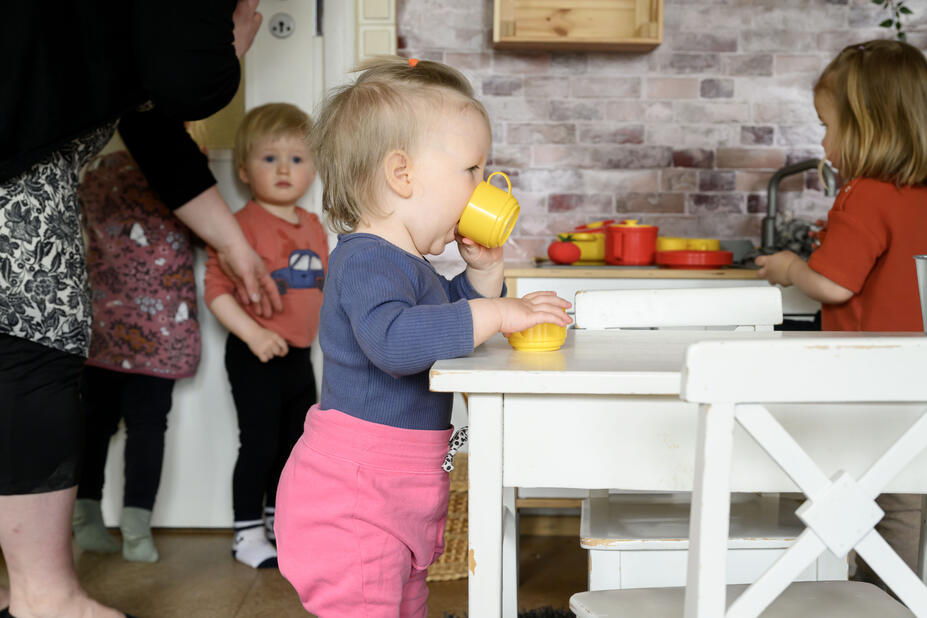 Aamupäivän ulkoilun jälkeen jää heti aikaa ennen ruokailua kotileikille sisällä. Hertta, 2 v, ja Elea, 1,4 v, alkavat keittää kahvia. Kahvipannu ja kupit siis esille, tällä kertaa juomasta tulee erityisen hyvää.