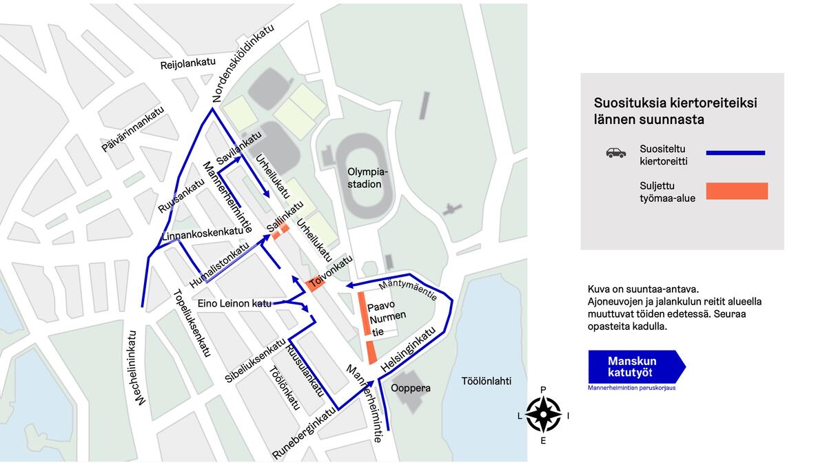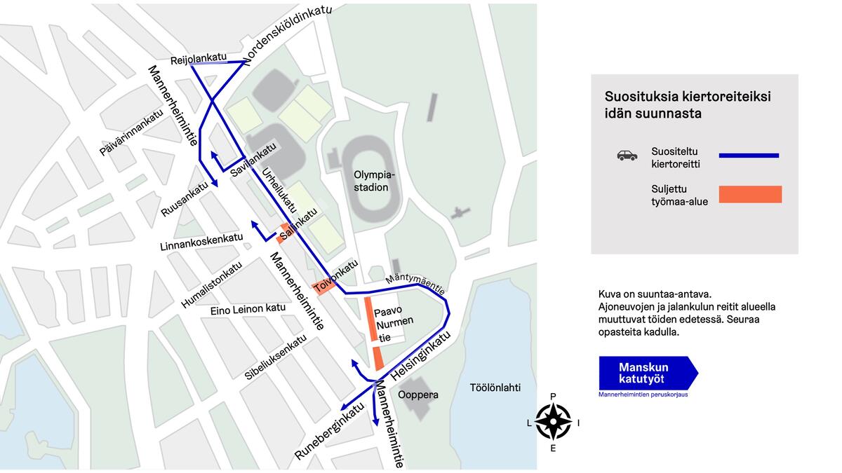 - Huolto- ja tontille ajo säilyy, mutta ajo onnistuu vain Mannerheimintien suunnasta. Myöhemmin huolto- ja tontilleajon suunta muuttuu ja ajo tapahtuu Urheilukadun suunnasta.