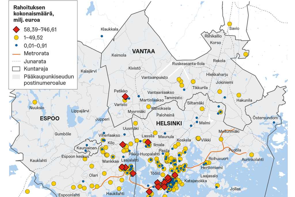 Vuonna 2022 pääkaupunkiseudulla pääomasijoitusten kokonaisarvo nousi yli 1,6 miljardin euron ja tästä lähes kaikki (98 prosenttia) kohdistui Helsingissä ja Espoossa toimiviin yrityksiin. Vuodesta 2013 rahoitusta keränneistä yrityksistä miltei kolme neljäsosaa (457 kappaletta) sijaitsee Helsingissä, ja Espoossa niistä on noin viidennes (123 kappaletta).