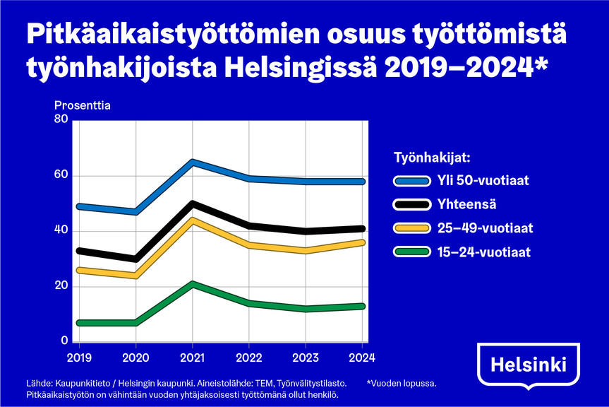 Pitkäaikaistyöttömiä on kaikissa ikäryhmissä, mutta erityisesti pitkittynyt työttömyys koskettaa yli 50-vuotiaita työttömiä. Helsingissä yli 50-vuotiaista työttömistä useampi kuin joka toinen on pitkäaikaistyötön.