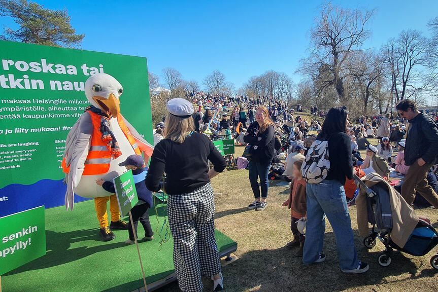 Roskaton Helsinki -kampanjan lokkimaskotit, Tuula ja Börje ovat tavattavissa Kaivopuistossa vappupäivänä klo 11–16.