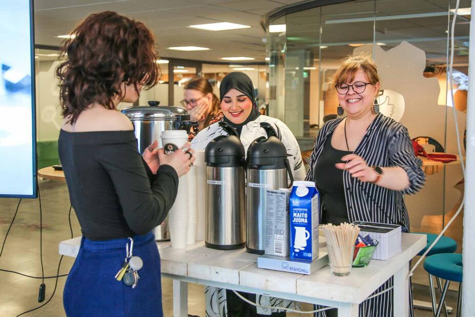 – Kahvilapäivät tuovat kivaa vaihtelua opiskeluun ja ohjelmaakin niihin on ihan kiva porukassa miettiä. Pyrimme siihen, että täällä olisi usein myös vierailijoita. Edelliskerralla meillä oli ständi, josta oli mahdollisuus saada tietoa ammattikorkeakouluun hakemisesta, Grace Lemley kertoo.