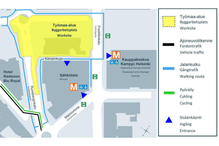 Kampin terveys- ja hyvinvointikeskuksen työmaa-alue laajenee Runeberginkadun suuntaisesti etelään päin. Työmaan käyttöön rajataan hieman lisää aluetta, jotta rakennusteknisiä töitä voidaan toteuttaa kaikkien kannalta turvallisesti.