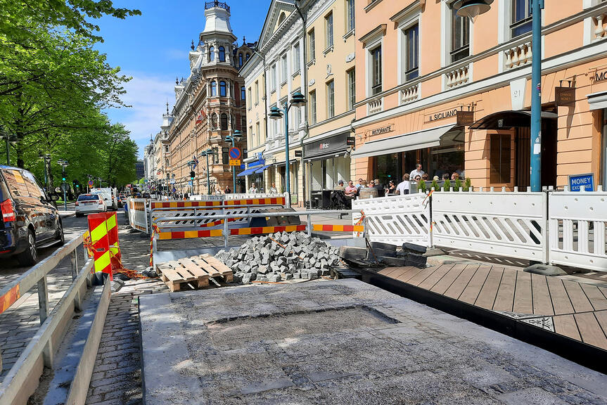 Esplanadeilla näkyy jo paljon uutta, kun levennysalueiden kiveäminen, reunustaminen ja hulevesikourujen rakentaminen kääntyvät loppusuoralleen. Pohjoisesplanadin puupintaiset korokerakenteet ovat paikoillaan, ja niihin asennetaan vielä luiskat esteettömyyden takaamiseksi. Istutukset ja kalusteasennukset jatkuvat tulevien parin viikon ajan.