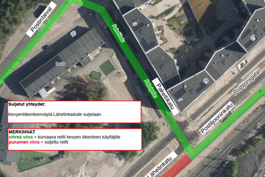 Täydennetty 15.10. väliaikaisten reittien merkintätiedolla ja 5.11. tarkemmalla tiedolla Postiljooninkadun uudelleen avaamisesta.