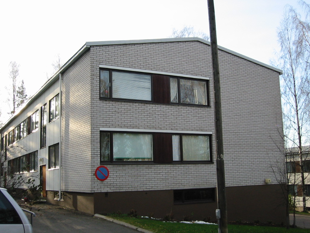 | Julkisivut: | Rakennuksen taitekatto on katettu pellillä. Julkisivut on verhoiltu kalkkihiekkatiilellä sekä valkealla mineritlevyllä. Ikkunoiden välit ovat puupaneelia. Betonisokkeli on maalattu ruskeaksi. |