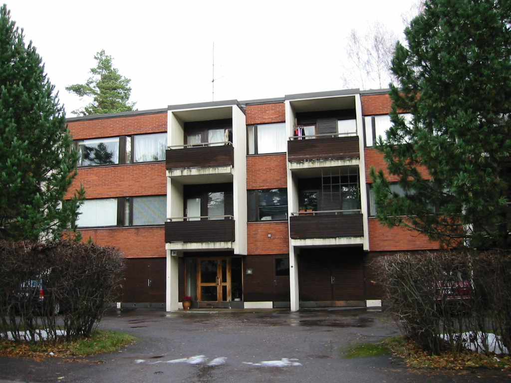 | Julkisivut: | Rakennus on katettu kattohuovalla. Julkisivut on verhoiltu punaisella julkisivutiilellä. Parvekkeiden rakenteet ovat valkoiseksi maalattua betonia ja tummaksi käsiteltyä vaakalaudoitusta. Autotallien ovet ovat tummaksi käsiteltyä puupaneelia. |
