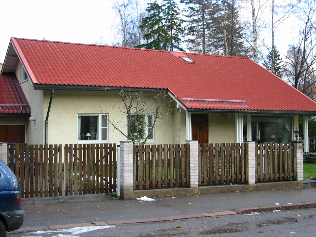 | Rakennushistoria: | Rakennuksen vanhin asu käsitti neljä huonetta ja keittiön sekä varaston ja saunan. Vuonna 1957 rakennuksen vintille suunniteltiin kaksi asuinhuonetta (arkkitehti Viljo Myyrinmaa). Vuonna 1959 tontille suunniteltiin aita, joka muodostui tiilipylväistä ja niiden välit vaaleaksi maalatuista laudoista. Vuonna 1965 rakennusta suunniteltiin laajennettavaksi luoteeseen kahden auton tallilla ja koilliseen siivellä, jonka kellaritiloihin sijoitettaisiin uima-allas ja yläkerroksiin asuintiloja (arkkitehti Viljo Myyrinmaa). Vuonna 1983 tontin länsinurkkaan suunniteltiin kylmä kalustovaja (arkkitehti Viljo Myyrinmaa). Vuonna 1997 tontin aidat uusittiin osin lankkuaidaksi ja osin maalatuin kalkkihiekkatiilipilarein vahvistetuksi lankkuaidaksi (arkkitehti Stefan Ahlman). |