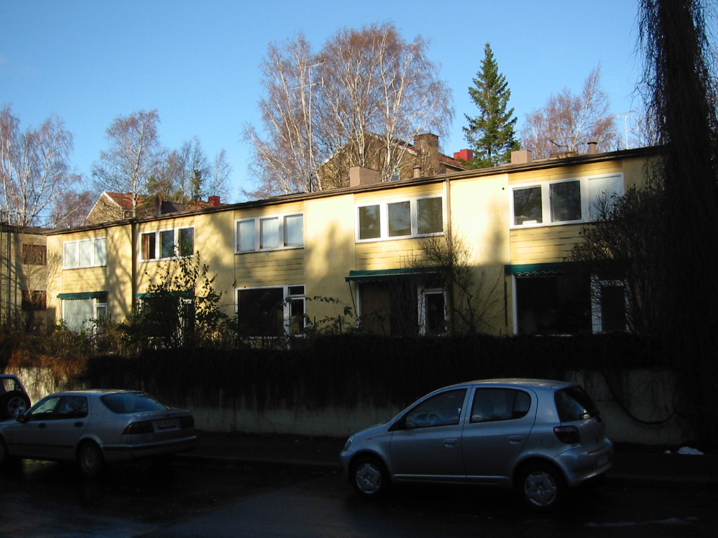 | Rakennushistoria: | Vuonna 1973 tontin eteläsivulle suunniteltiin osin betoni- ja osin lautarakenteinen aita (arkkitehti Viljo Karppinen). Vuonna 2002 rakennuksen ikkunat ja ovet suunniteltiin vaihdettavaksi alumiinipintaisiksi puuikkunoiksi ja -oviksi ja ikkunoiden väliset paneelit vaakapuupaneeliksi (insinööri Tarmo Sipola). |