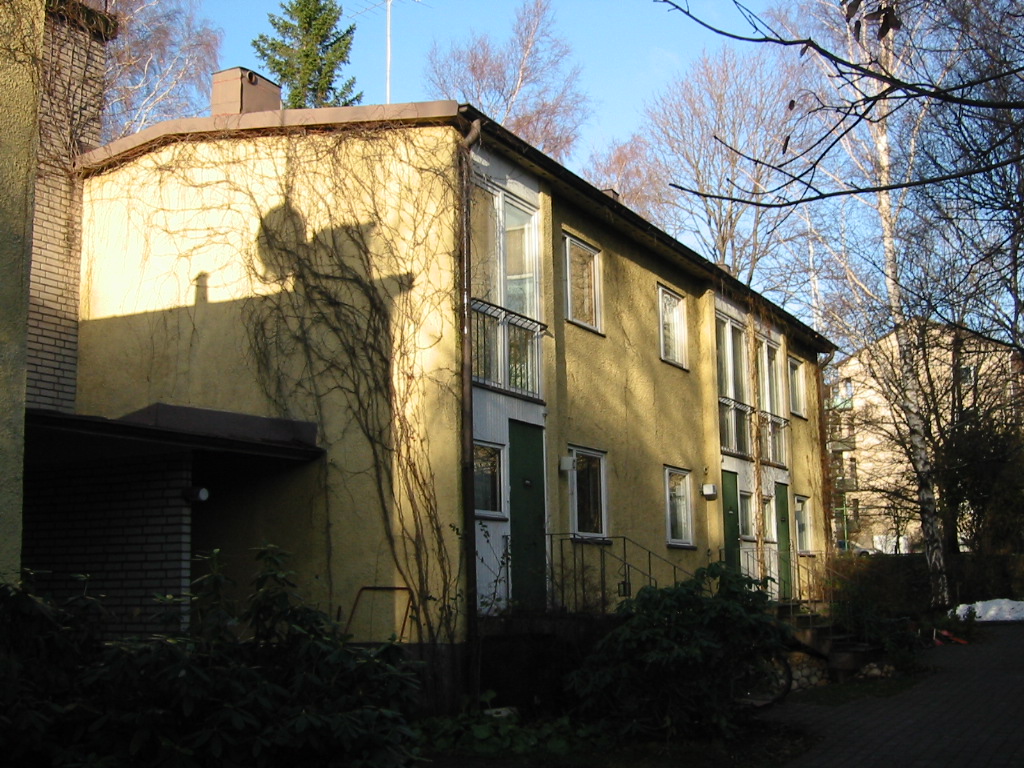 | Rakennushistoria: | Vuonna 1973 tontin eteläsivulle suunniteltiin osin betoni- ja osin lautarakenteinen aita (arkkitehti Viljo Karppinen). Vuonna 2002 rakennuksen ikkunat ja ovet suunniteltiin vaihdettavaksi alumiinipintaisiksi puuikkunoiksi ja -oviksi ja ikkunoiden väliset paneelit vaakapuupaneeliksi (insinööri Tarmo Sipola). |