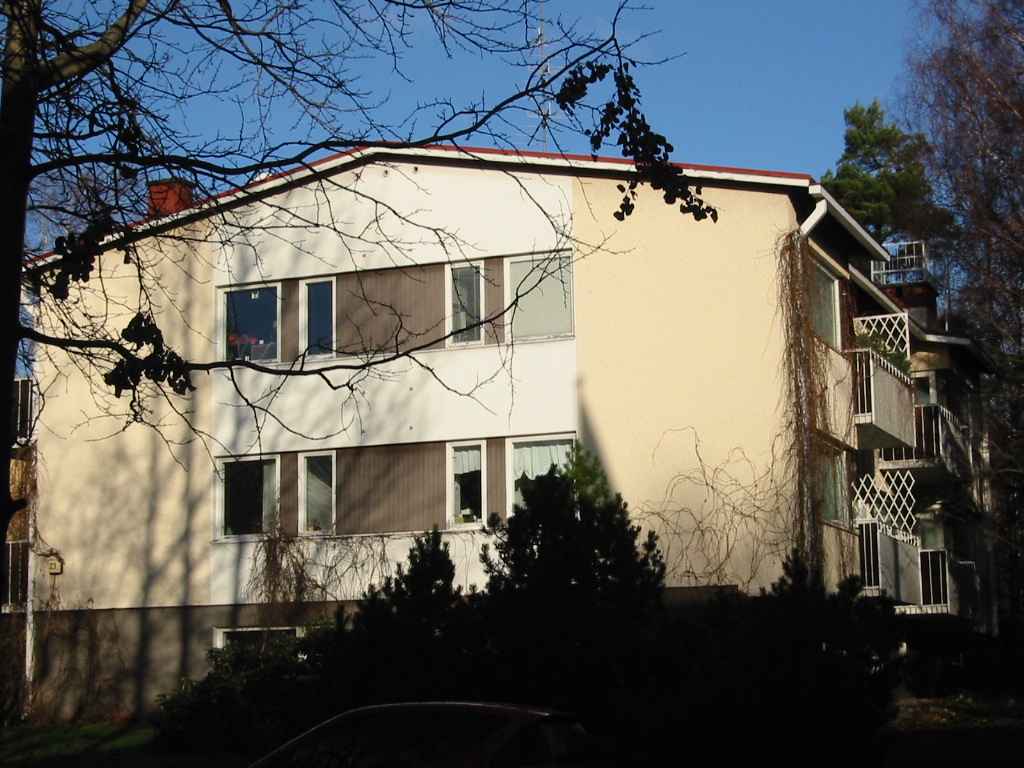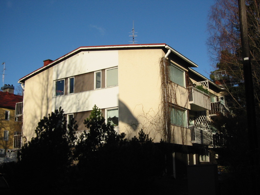 | Julkisivut: | Rakennuksen loiva taitekatto on katettu pellillä. Julkisivuissa vuorottelee valkeaksi maalattu sileä rappaus sekä kellertäväksi maalattu roiskerappaus. Parvekkeiden kaiteet ovat mineritlevyä. Ikkunoiden väliset paneelit ovat tummanruskeaksi maalattua puupaneelia. |