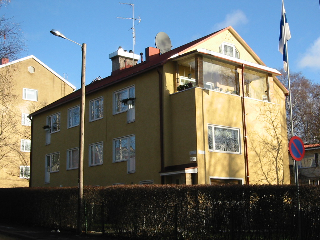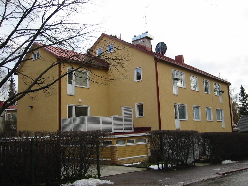 | Rakennushistoria: | Alkuperäispiirustuksissa rakennuksen pohjoispäätyyn oli sijoitettu viisi yksiötä ja eteläpäädyssä oli kaksikerroksinen suuri asunto, johon liittyi lääkärin vastaanottotilat. Vuonna 1961 rakennuksen eteläpäädyn parveke suunniteltiin katettavaksi (arkkitehti Rudolf Lanste). Vuonna 1999 rakennukseen suunniteltiin runsaasti sisätilamuutoksia. Ensimmäisen kerroksen kaksi yksiötä suunniteltiin laajennettaviksi kaksioiksi ja lääkärin vastaanottotiloista suunniteltiin uusi kaksio. Toisen kerroksen yksi yksiö suunniteltiin laajennettavaksi kaksioksi. Eteläpäädyn parveke lasitettiin. Rakennuksen luoteiskulmaan lisättiin polkupyöräkatos ja sen päälle toiseen kerrokseen rakennettiin parveke. Tontille suunniteltiin valkeaksi maalattu lauta-aita ja jätekatos. (arkkitehti Pet Michael). |