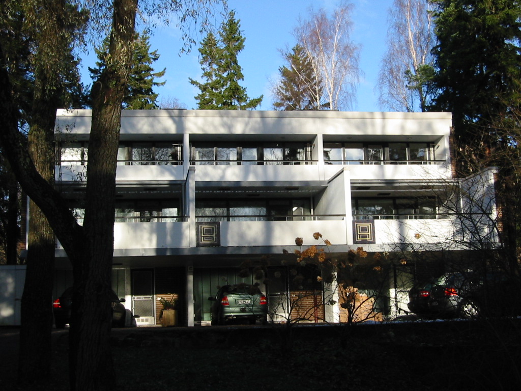 | Julkisivut: | Rakennuksen tasakatto on katettu bitumilla. Päätyjulkisivut on verhoiltu punaisella julkisivutiilellä. Muilta osin julkisivut ovat vaaleaksi maalattua betonia ja mineritlevyä. Julkisivujen erityispiirre on asuntojen eteläparvekkeisiin tehdyt mosaiikkikoristeet "9A", "9B" ja "9C". |