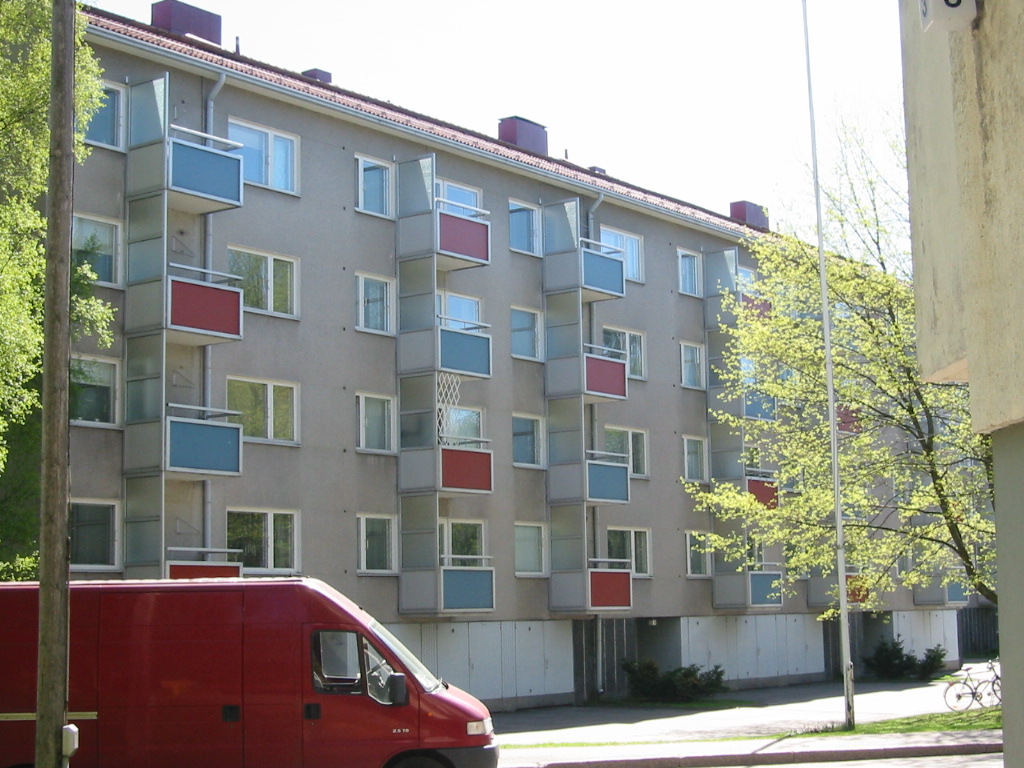 | Rakennushistoria: | Vuonna 1995 rakennuksen parvekkeita suunniteltiin kunnostettaviksi. Teräsprofiilirakenteet muutettaisiin alumiiniprofiileiksi, aaltoalumiinikaidelevyt laminaattilevyiksi ja päätyjen rautalankalasiseinämät uusittaisiin (arkkitehti Ari-Jukka Martikainen). |