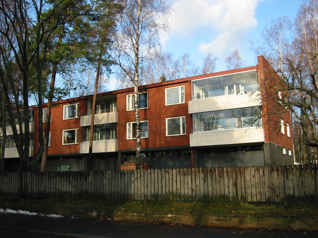 | Julkisivut: | Rakennus on katettu pellillä. Julkisivut on verhoiltu punaisella julkisivutiilellä. Parvekkeiden kaiteet on rapattu valkeiksi. Kivijalassa on osin kivimurskerappaus osin kivijalka on verhoiltu tumman harmaaksi maalatulla pystylaudoituksella. |