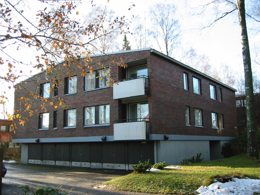 | Rakennushistoria: | Tontilla sijaitsi ennen vuonna 1967 valmistunutta rakennusta Sulo Hakkaraisen vuonna 1952 suunnittelema puurunkoinen pientalo. Vuonna 1985 asunto A 8:aan suunniteltiin liitettäväksi naapuriyksiö, joka muutettaisiin saunaosastoksi (arkkitehti Antti Ilveskoski). Vuonna 1990 rakennuksen ensimmäisen kerroksen länsipäädyn kaksio ja kolmio suunniteltiin yhdistettäviksi (SRT-suunnittelu). |