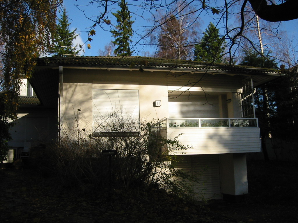 | Rakennushistoria: | Vuonna 1983 ensimmäiseen kerrokseen ja kellariin suunniteltiin runsaasti sisätilamuutoksia. Kellarissa sauna uusittaisiin, rakennettaisiin takkahuone, biljardihuone, uima-allas ja autotalliin lisättäisiin erillinen askartelutila. Ensimmäisen kerroksen tilajako uusittaisiin lähes täysin. Rakennuksen vintti otettaisiin asuinkäyttöön ja sinne rakennettaisiin yksi asuinhuone. Samassa yhteydessä julkisivujen aukotuksissa tapahtuisi paljon muutoksia (Arkkitehtitoimisto Rajamäki & CO). Vuonna 1998 tontin länsi-, etelä- ja itäsivuille suunniteltiin valkeaksi maalattu lauta-aita (arkkitehti Kimmo Karjalainen). |
