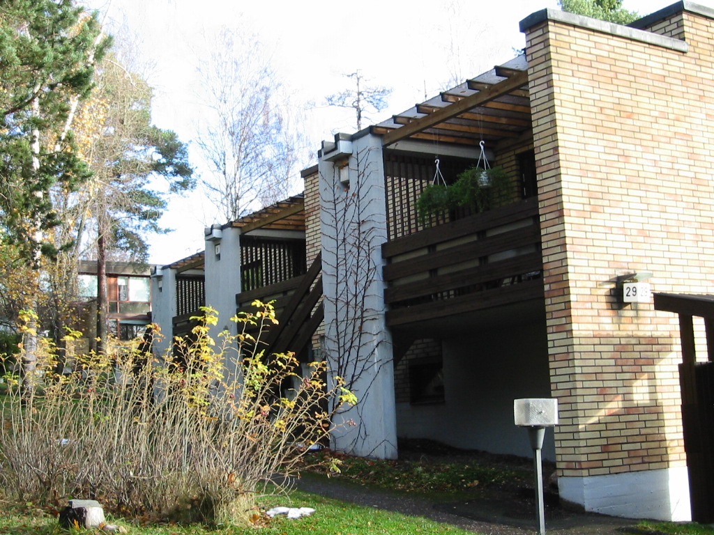 | Julkisivut: | Julkisivut on verhoiltu keltaisella julkisivutiilellä. Osin julkisivut ovat vaaleaksi maalattua betonia. Parvekkeiden kaiteet ja katos ovat tummaksi käsiteltyä puuta. |