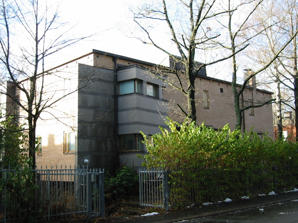| Julkisivut: | Julkisivut on verhoiltu kapealla keltaisella julkisivutiilellä ja harmaalla graniitilla. Ovet ja ikkunat ovat lakattua tammea. |