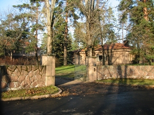| Ymp. kuvaus: | Tontin etelälaitaa rajaa vanha kiviaita, joka rakentuu luonnonkivistä muuratuista jalustasta ja pylväistä, joiden väliset osat ovat tummaksi käsiteltyä lautaa. Tontin sisäänkäynnin kohdalla on komea takorautaportti. |