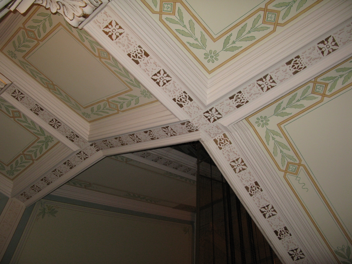 | Porrashuoneen alkuperäinen asu on varsin pitkälle säilynyt. Maalauskoristelu vaikuttaa osittain myöhäisemmältä. |