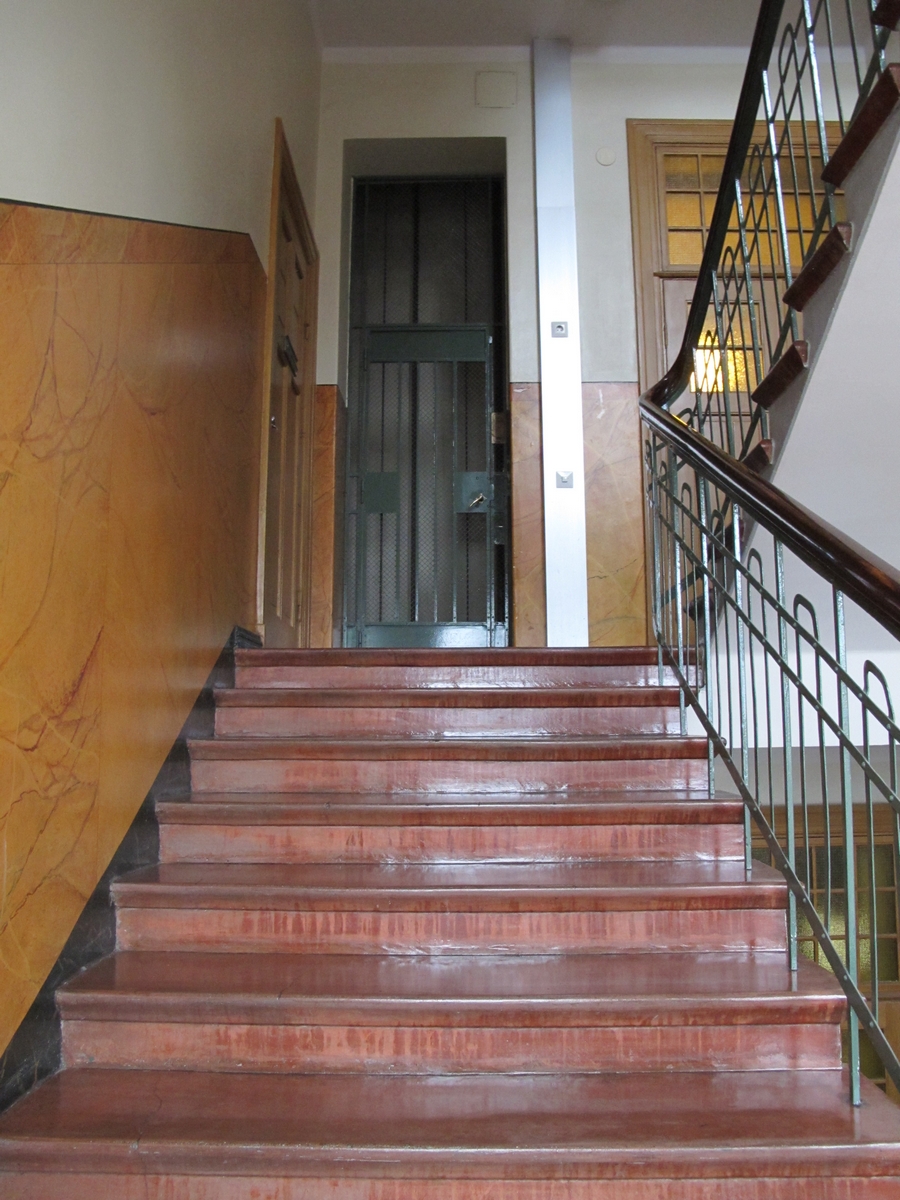 | Porttikongista tullaan sisään tuulikaappiin ja käännytään vasemmalle U-malliseen porrashuoneeseen. Porras on kaksivartinen ja kaarevasivuinen. Askelmat kiertyvät kiilan muotoista lepotasannetta kohti. Seinät on rapattu ja marmoroitu alaosasta keltaiseksi. Yläosa on vaalea. Rajakohdassa on keltaiseksi marmoroitu boordi. Katto on tasainen ja valkoiseksi maalattu. Tuulikaapin vaaleat seinät on hiottu ja maalattu kiiltäviksi ja seinän vaalean sininen yläosa taittuu holkkalistan tapaan kohti tasaista kattoa. Tasot ja askelmat ovat punaista hiottua betonia. Eteishallissa lattiassa on uusittu harmaalla keraamisella laatalla. Kaide on teräsrakenteinen pinnakaide, jossa neliöteräspinnat on sidottu lattateräksin. Pinnojen välissä on lattateräksestä taivutettu pitkäsakarainen U-muoto. Kiinnitysniitit ovat näkyvä koristeaihe. Käsijohde on puuta, samoin kuin kaiteen alussa oleva tolppa, jossa on suippeneva yläosa. Hissi vuodelta 1934 on sijoitettu asuntovyöhykkeelle. Korin etuseinä on ruutuverkkoa. Hississä on funkis-sisustus. Ovet ovat alkuperäiset lasiaukkoiset ja yläikkunalliset peiliovet. Ikkunat ovat alkuperäiset. |