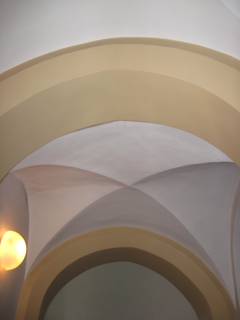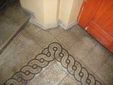 | Pihalta tullaan kaksiosaiseen ristiholvattuun eteishalliin, jossa noustaan pari askelmaa. Eteisen osien välillä on suippokaaren muotoiset vyökaaret. Porras on kaksivartinen kaarevasivuinen U-porras, jonka askelmat kiertyvät kiilamaiselle lepotasanteelle. Kerrostasanne on muodoltaan suippo. Porrashuoneen ja seinät on rapattu ja maalattu, alaosa on maalattu kellertäväksi, yläosa vaalea. Kattopinnat ovat sileät ja valkoiset, ylätasanteella holkkakattolista. Portaikon askelmat ja tasanteet ovat hiottua betonia, eteisessä mosaiikkibetonilaattaa, jossa mustakuvioinen koristekehys. Kaide on teräsrakenteinen kaide, jossa teräspinnat on sidottu vaakasuuntaisin lattateräksin. Kaiteen yläosassa on leveä teräspeltinauha, jonka pintaan tehdyistä rei'istä näkyvät spiraalille taivutetut pinnojen päät. Käsijohde on puuta. Hissiä ei ole. Ovet ovat alkuperäiset, kaarevat, yläikkunalliset ja lasiaukolliset jugend-peiliovet. Alkuperäiset ikkunat, joissa pullonpohjalasi. |