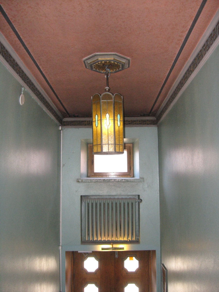 | Hyvin säilynyt erikoinen porras, jossa on orientaalisvaikutteiset punertavat katot ja niissä hienot alkuperäisvalaisimet. |