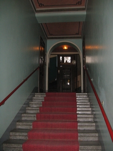 | Sisäänkäyntiä reunustavat harmaat graniittipintaiset pilasterit, joissa on valkoiset akroterion-päätteiset kapiteelit. Oven yläpuolella on palkistoaihe, jonka päällä puolipyöreä lunetti-kenttä ja siinä naisfiguuri reliefinä. Ulko-ovi on tammirakenteinen peiliovi, jossa on kuusikulmaisia lasiaukkoja. Ulko-ovessa on putkivedin. Sisäänkäyntisyvennyksestä tullaan pitkänomaiseen eteishalliin, jossa noustaan n. puoli kerrosta suoraa porrasta pitkin kohti porrashuonetta. Porrashuoneen ja eteishallin välillä on kaariaukko. Porras on yksivartinen kiertävä U-porras. Kerrostasanne ulottuu molemmilta sivuilta portaan ohi ja tasanteen päitä erottavat keskiosasta kaariaukot. |