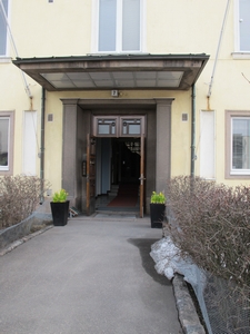 | Sisäänkäyntisyvennystä reunustavat hieman julkisivupinnasta ulkonevat pilasterit. Sisäänkäyntiä hallitsee kookas suorakulmainen lippa, jossa on valokatto. Ulko-ovi on alkuperäinen tammirakenteinen lasiaukollinen pariovi. Profiloidut puitteet ja ympyrän malliset koristeaiheet jakavat lasiaukot epäsymmetrisesti pienempiin osiin. Oveen liittyy suorakulmainen yläikkuna, jossa samat koristeaiheet jatkuvat. Sisäänkäyntisyvennyksestä tullaan runsaasti koristeltuun art deco henkiseen eteishalliin. Eteishallin päätteenä on kapeampi neliömäinen välikkö, jossa noustaan muutamia askelmia kohti varsinaista porrashuonetta. Eteishallin on erotettu porrashuoneesta alkuperäisin heilurisaranoiduin lasiaukkoisin pariovin. Porras on kaksivartinen U-porras, jossa on kiilamainen lepotaso. Kerrostasanne on suorakulmainen. Varsinaisen porrashuoneen takana on pieni palvelusväelle tarkoitettu tasanne, johon kuljetaan pihan puolelta omalla hissillään. |