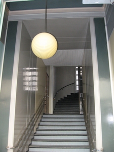 | Eteishallin seinät ovat kiiltävät, toinen sivuseinä on vaalean sininen ja toinen keltainen. Toisella seinällä on patterisyvennys, jonka edessä patterisuojus. Eteishallin katon keskiosassa on kookas peili, jota reunustavat kromatut listat. Peiliä ympäröivä muu kattopinta on tumma siniharmaa. Seinän ja katon rajassa on profiloitu kattolista. Porrasvälikön etuosan seinät ja katto on jäsennelty pystyurien avulla kenttiin, jotka on maalattu harmaan sävyyn. Välikön loppuosan seinät ovat kiiltävän keltaiset ja katossa on valkoinen uritus. Porrasvälikön sivuseinillä on virtaviivainen "kaide" vaakasuuntaisista kromatuista lattateräksistä, jotka kiertyvät pielien ympäri. Varsinaisen porrashuoneen seinät ovat vaaleankellertävät. Tasanteiden kattopinnat ovat valkoiset. Eteisen lattiassa on uusi sininen klinkkerilaattapäällyste. Portaan askelmat ovat harmaasävyistä mosaiikkibetonia, tasanteilla on uusi muovipäällyste. Kaidetta ei ole vaan pyöreä puinen käsijohde kiertää seinällä. Käsijohde on maalattu mustaksi ja sen nuppipäät keltaisiksi. Hissi on alkuperäinen m/ Asea ja se sijaitsee porrassyöksyjen välissä. Hissikorin huoliteltu sisustus on punasävyistä viilua, jossa on intarsiaviivakoristelua vaaleammalla puulla. Seinällä on peilit, joissa mustat listat ja edessä kolmesta kromatusta vaakaputkesta koostuva kaide. Katto on vaalea ja sitä reunusta mustalla ja valkoisella korostettu lista. Hissikuilun seinämät ovat teräsrunkoiset teräsverkkoseinät. Alatasanteella verkon sijalla on uritettu lasi ja lasilistat ovat kromatut. Huoneistojen ovet ovat alkuperäiset tammipuiset laakaovet, joiden reunassa on kapea lista. Oven kehys on viimeistelty uralista, jonka keskiosa on maalattu harmaaksi ja reunat lakatut. Karmin näkyvä osa on maalattu harmaaksi. Ovissa on alkuperäiset putkivetimet. Parvekkeen vaakasuuntaan jaetut lasiovet ovat alkuperäiset, lasit struktuurilasia. Eteishallin katossa on hieno, ilmeisesti vanha valaisin. |