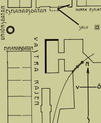 | Näkymä Hotelli Seurahuoneen (nyk. Kaupungintalo) parvekkeelta itään päin. Kenraaliluutnantti G. R. Ehrnrootin hautajaissaattue tulee kohti Pohjois Eslanadi- kadulla. Vasemmalla kohoaa Keisarinnan kivi. Keskellä taustalla näkyy Norrménin punatiilinen linna, joka omalta osaltaan on luomassa Katajanokan yhtenäistä arkkitehtoonista linjaa. |