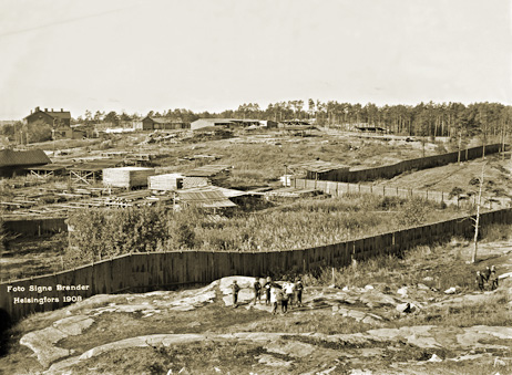 Sörnäs Snickeri Ab:n lautatarhaa osoiteessa Vallila 6. Kuva on otettu Mäkelänkatu 2:n kohdalta luoteeseen.