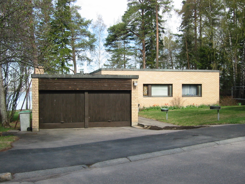 | Julkisivut: | Rakennus on katettu kattohuovalla. Räystäslistat ovat kuparipeltiä. Julkisivut on verhoiltu keltaisella julkisivutiilellä. Autotallin ovet ovat ruskeaksi käsiteltyä puupaneelia. Sokkeli on betonia. |
