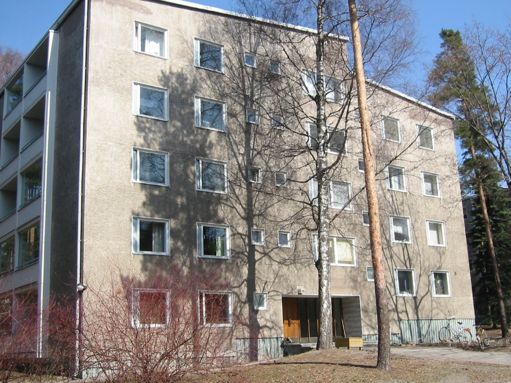 | Julkisivut: | Rakennus on katettu pellillä. Julkisivut ovat rusehtavaksi maalattua roiskerappausta. Parvekkeiden kaiteet ovat betonia. Harmaaksi maalattu betonisokkeli on voimakkaasti uurrettu. |