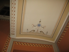 | Porrashuoneen pitkällä sivulla olevaa kerrostasannetta kannattaa I-teräspalkki laakeine holveineen. Porrassyöksyjä kantavat rappausprofiloidut ratakiskot, välitasanteilla laakeat ristiholvit. |