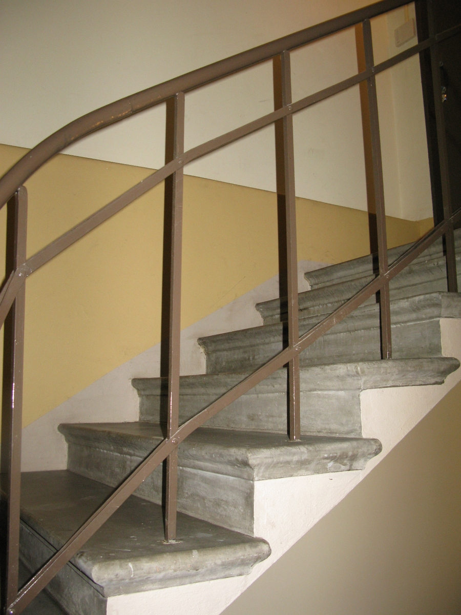 | Seinien alaosat kellertäviä, yläosat ja katot vaaleat, välissä vihreä rajausviiva. Maalattu vihreä jalkalista. Portaat ja tasanteet hiottua betonia. Kaide yksinkertainen ruskeaksi maalattu takorauta/teräsputkikaide. Alkuperäiset puuikkunat ja puiset peiliovet, lukuunottamatta ensimmäisen kerroksen levyrakenteista asunto-ovea ja ullakon teräsovea. Ikkunapenkit puuta. Sähkökalusteet uudehkoja. Posliinikantaiset opaalilasipallot seinillä (1960-l?). Levypatterit. |