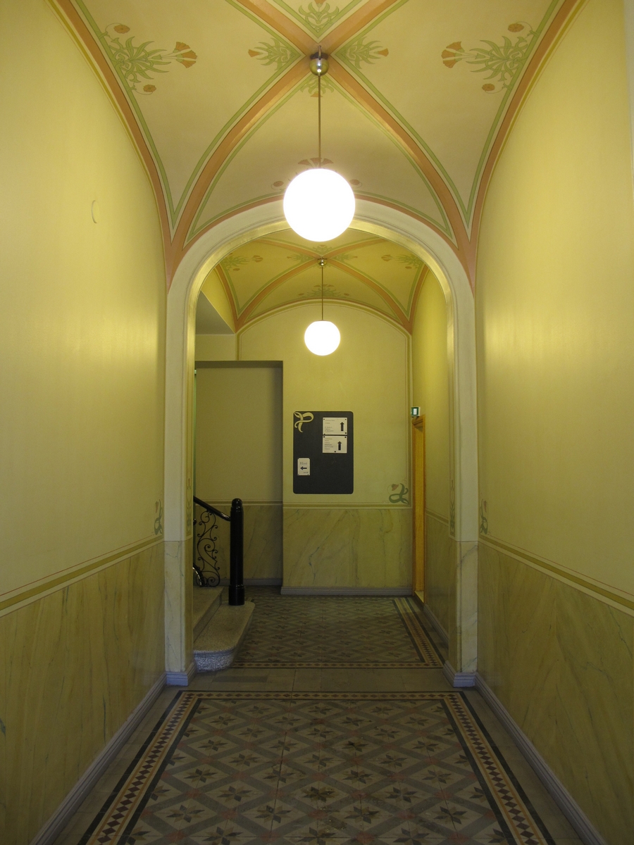 | Kadulta tullaan sisään kolmiosaiseen suorakaiteen muotoiseen eteishalliin. Porrashuone on eteishalliin nähden poikittaissuuntainen ja sijaitsee eteishallin vasemmalla puolella. Porras on suora ja kaksivartinen. Ensimmäinen porrassyöksy on muita pidempi. Askelmat kiertyvät kiilan mallista lepotasannetta kohti. Ylin ja alin lepotasanne ovat suorakulmaiset ja tilavat. Kerrostasanteen toinen kulma on kerroksittain vaihdellen joko viistottu tai pyöristetty. Toisella reunalla on kerrostasanteen laajentuma, johon alimmissa kerroksissa kuljetaan kapean välikön kautta. Seinät on rapattu ja marmoroitu alaosasta vaaleanvihreäksi. Yläosa on maalattu vaalealla sävyllä. Rajakohdassa on maalattu lista, jossa on valkoisella pohjalla tummien viivojen rajaama vaaleanvihreä raita. Porrashuoneen katto on tasainen ja valkoiseksi maalattu. Porrassyöksyjen alapinnassa on pienet listat. Yhdellä kerrostasanteella (4.krs) on koristeellinen kattolista. Muutama palkki päättyy koristeelliseen konsoliin. Eteishallin seinissä on boordilistan yläpuolella jugend-henkisiä, vanamonkukkia esittäviä koristemaalauksia tilojen nurkissa sekä eteisen osia rajaavien kaariaukkojen pielissä. Eteishallin katossa on ristiholvit. Ensimmäisen osan ristiholvi on rapattu ja maalattu valkoiseksi. Toisessa ja kolmannessa osassa holvin laet on maalattu vaaleanpunaisella. Holvipintoihin on maalattu jugend- kukkakoristeita vaaleanpunaisella ja vihreällä. Portaan tasanteet ja askelmat ovat mosaiikkibetonia. Kerrostasanteilla ja lepotasanteilla lattiassa on kapea musta mosaiikkibetonikehys. Eteishallin lattia on koristeellista betonilaattaa. Laattojen poikki kulkee viistosti harmaa raita, joka päättyy laatan vastakkaisissa kulmissa punaiseen tehostekuvioon. Laattojen toisissa kulmissa on musta ja keltainen salmiakkikuvio. Laatoista muodostuu kuvio, jota punaiset neliöt ja mustakeltaiset tähtikuviot rytmittävät. Kuviolaattoja kehystävät vinoruutuiset tummempisävyiset laatat. Kaide koostuu lattateräksestä taivutetuista koukeroisista kaide-elementeistä. Kerros- ja välitasanteilla kaiteen päätteenä on koristeelliset valurautatolpat. Käsijohde on puuta, samoin kuin kaiteen alussa oleva pyöreä tolppa, jonka kapeneva yläosa on pyöristetty. Hissi vuodelta 1964 on sijoitettu asuntovyöhykkeelle. Hissi on uusittu 2008. Yläikkunalliset peiliovet on uusittu. Ikkunat ovat alkuperäiset. |