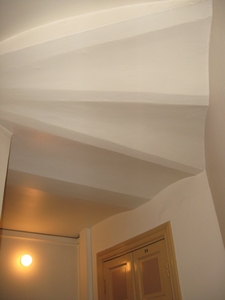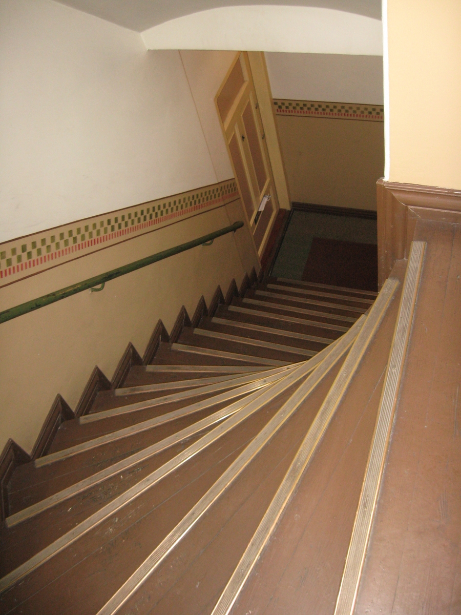 | Portaaseen tullaan sisään suoraan pihalta. Porras on kaareva yksivartinen kookkaan keskipilarin ympäri kiertyvä porras. Kerrostasanne kiertää keskipilaria kahdelta sivulta. Porrashuoneen kaksi nurkkaa ja keskipilarin yksi nurkka on viistetty. Ylimmässä kerroksessa jatkuu kerrostasanne käytävänä portaan ohi. Seinät on rapattu ja maalattu, alaosa vaalean ruskea, yläosa valkoinen, rajakohdassa sabloonaornamentti vaaleanruskealla pohjalla, jossa ruskeiden viivojen välissä punaisia ja vihreitä pikku neliöitä. Katot ovat holvatut ja valkoiset. Portaikon askelmat ja tasanteet ovat puuta. Alatasanteella lattiapäällysteenä on muovimatto. Kaidetta ei ole, ainoastaan seinällä kiertävä puinen käsijohde. Hissiä ei ole. Ovet ovat alkuperäiset paripeiliovet. Ikkunat ovat vanhat. |