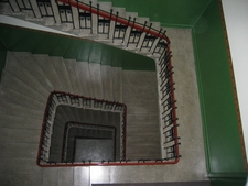 | Tilallisesti dramaattinen, yllättävä ja monumentaalinen. Porrashuone on muodoltaan neliö, jonka laitoja porrassyöksyt kiertävät siten, että jokaiseen nurkkaan jää lepotasanne ja hallin keskelle avoin kuilu. Korkea ja ylös asti avoin porrashalli saa ylävaloa kattoikkunasta. Kussakin kerroksessa on vain yksi asunto. Rakenne on laattamainen (ilm. teräsbetonia), palkit erottuvat hieman. |